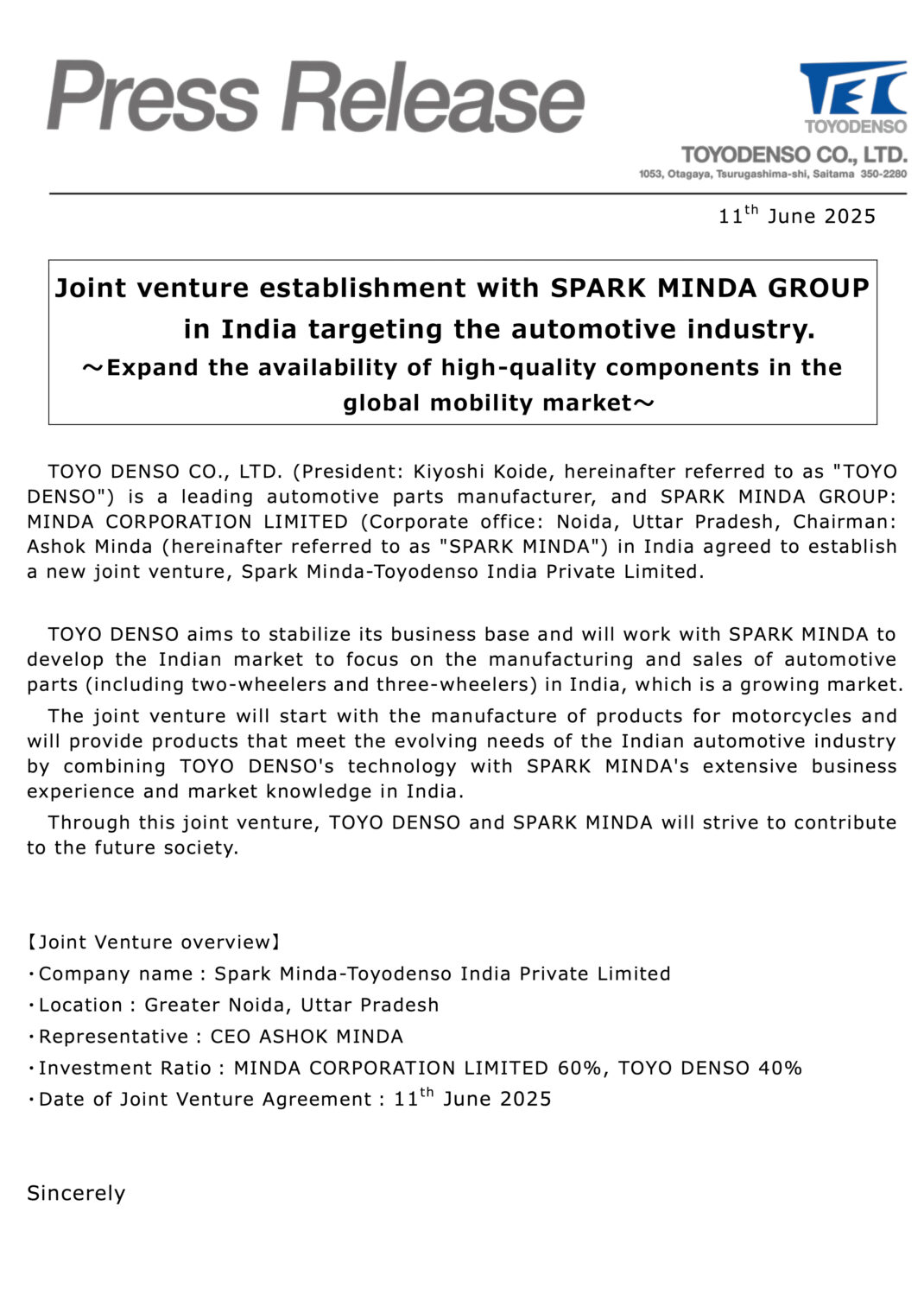 TOYO DENSO CO., LTD. (President: Kiyoshi Koide, hereinafter referred to as “TOYO DENSO”) is a leading automotive parts manufacturer, and SPARK MINDA GROUP: MINDA CORPORATION LIMITED (Corporate office: Noida, Uttar Pradesh, Chairman: Ashok Minda (hereinafter referred to as “SPARK MINA”) in India were agreed to establish a new joint venture, Spark Minda-Toyodenso India Private Limited.